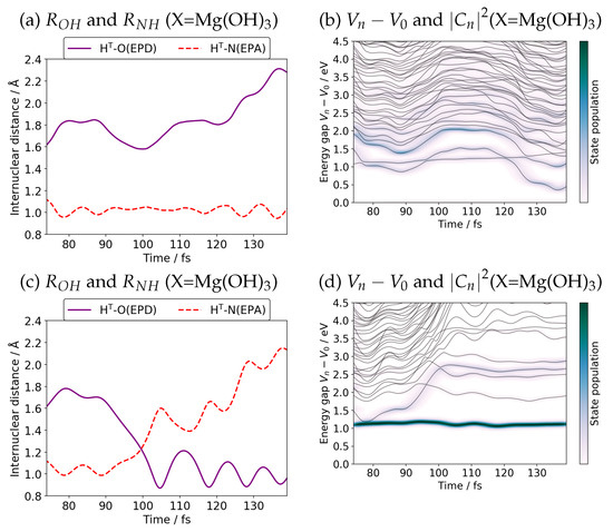 Let us perform the simplified path-branching [20] for the case of X=Mg(OH) as an illustrative example. In Figure 8, we track two SET paths after the first branching time 75 fs. The path remaining in the valley of charge separation state (see Figure 2) is presented in panel (a) and (b) of Figure 8 (denoted as Group1), while the charge recombination path is illustrated in panel (c) and (d) (Group2). The SET path of Group2 resumes to run with the same adiabatic electronic state coefficients of Equation (8) for the S1 state only and zero otherwise, while for Group1 are retained as were except setting the coefficient for the S1 to zero. The crossing between the bond lengths R and R in panel (c) clearly indicates that HT of Group2 has returned to the site of EPD (Mn site), while the path in Group1 remains in the proton transfer region. Panel (b) shows that the path of Group1 undergoes nonadiabatic interaction with the S1 state many times. Likewise the S1 state seems to lose the electronic population back to the charge separation state before about 100 fs (see Figure 8d). Note that these individual paths in Figure 8 do not represent the unbranched SET path of Figure 7c or Figure 9c.