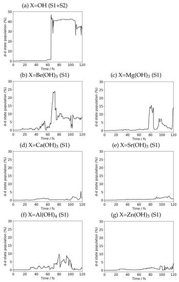 To identify the substituent effect on charge recombination, we compare the panels Figure 7b–g with Figure 7a. First we recall that the energy at in each graph indicates the initial energy spectra of the states at a geometry. In the panel Figure 7a for the X=OH system, we have two near-degenerate d–d origin states S1 and S2 at about 1.5 eV, while those two states are widely split to the states, now found at around 0.9 eV and 2.0 eV, respectively, in all the other systems of Figure 7b–g. We do not observe a significant difference among them, or, we do not see much dependence on the choice of the doped atoms Be, Mg, Ca, Sr, Al, and Zn in the energy level of S1 and S2 at . The large split between S1 and S2 energies must have been induced by the chelate-like addition of X to Mn than simple -OH bonding (see Figure 1).