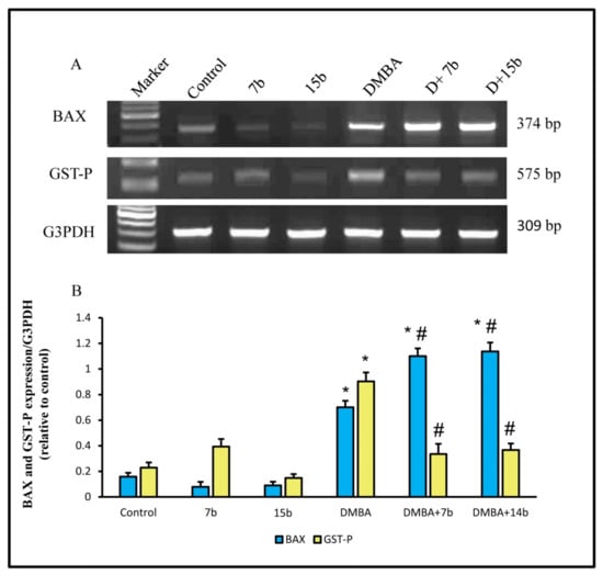 Effect of 7b and 15b compounds on changes in gene expression induced by DMBA in breast. Values are means ± SE of 10 rats. * p < 0.05 vs. control group; # p < 0.05 vs. DMBA group. (A) Upper panels are mRNA expression of examined gene. (B) Lower columns are densitometric analysis of gene expression.