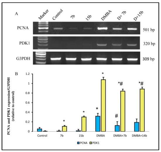 The absence of PDK1 expression was observed only in the 7b and 15b dosed groups. DMBA administration led to a significant increase in mRNA expression of PDK1 in the breast tissue of adult female rats (p < 0.05). Treatment of the DMBA group with 7b and 15b led to a significant decline in the elevated mRNA expression in comparison to the DMBA group, particularly in the 7b group (p < 0.05) (Figure 2).
