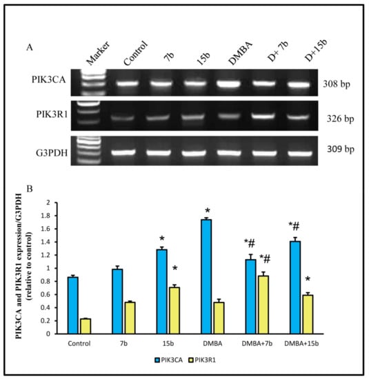 Evaluation of PIK3CA mRNA expression in the breast tissue of DMBA administered adult female rats resulted in a significant increase (p < 0.05) of mRNA expression of PIK3CA in the breast tissue of adult female rats when compared to the negative control group. Treatment of the DMBA group with 7b and 15b led to a significant decline (p < 0.05) of the elevated mRNA expression when compared to the DMBA group (Figure 3).