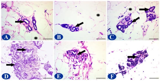Results of histopathological assessment. (A) Negative control group shows the normal structure of the acini (arrow) with adipose tissue inbetween (*). (B) 7b group showing normal acini (arrow) and adipocytes (*). (C) The 15b group showed normal lobules (arrow) and adipose tissue (*). (D) Breast tissue from the DMBA group showed extensive proliferation of cancer cells (arrows). (E) Adult female rats administered DMBA and treated with 7b showed marked regression of tumor mass (arrow). (F) breast tissue of DMBA-treated rats with 15b revealed moderate regression of tumor mass (arrow). H & E. Scale bar = 50 μm.