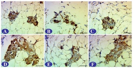 Results of Immunohistochemical Assessment of Bcl2. (A) Breast tissue of negative control group showed over-expression of Bcl2. The (B) 7b group showed increased acinar Bcl2 expression. (C) 15b group showed marked Bcl2 expression in the lobular tissue. (D) Breast tissue of DMBA-dosed rats revealed over-expression of Bcl2 in the tumor mass. (E) Breast tissue of DMBA dosed rats treated with 7b revealed faint Bcl2 expression. (F) Moderate Bcl2 expression was detected in the DMBA group treated with 15b. Scale bar = 50 μm.