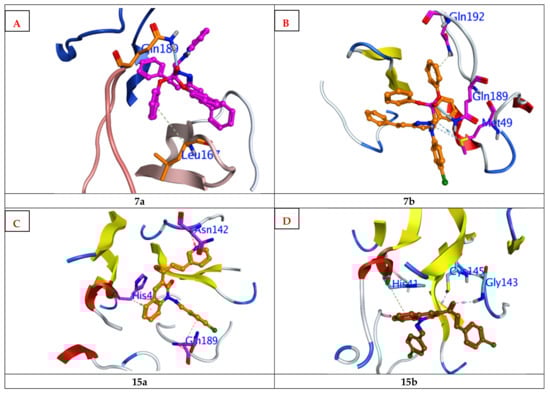 These compounds combined with important amino acid residue (Gln189) by formation of strong H-bonds with equal bond distances about 2.9° (Figure 6 and Figure 7). The variation in the interaction mode between 7a, 7b, 15a, and 15b and the hydrophilic amino acid backbone (Figure 6 and Figure 7) postulated that the hydrophobicity and membrane permeability play a circular role in the absorption of the molecule in biological systems.