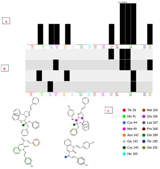 (A) PLIF histogram plotted, (B) statistical key interaction, (C) interaction key for (7a, 7b, 15a, and 15b) with active site.
