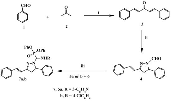 Benzaldhyde 1 was reacted with acetone 2 under reflux in the presence of sodium hydroxide in absolute ethanol to give dibenzalacetone 3, which reacted with hydrazine hydrate and formic acid under reflux to give 5-phenyl-3-styryl-4,5-dihydro-1H-pyrazole-1-carbaldehyde 4, which reacted with amine derivatives 5a, b and triphenyl phosphite 6 in acetonitrile with the addition of a few catalytic amounts of perchloric acid to give α-aminophosphonate derivatives 7a, b in 90 and 92% yields, respectively (Scheme 1). The synthesized compounds 7a and b were elucidated by 1H NMR and 13C NMR spectroscopic techniques. The elucidation of phosphonate derivatives 7a, b by 1H NMR spectra showed the disappearance of CHO group and appearance of peak as douplet at 7.54 for (HN-CH-P-), peaks around 3.08–3.72 for protons of aromatic benzene ring, peaks around 3.82, 3.85 for protons of aromatic benzene ring, triplet peaks around 3.92–4.14 for methylene group of pyrazole ring, broad peak at 8.75 for NH group, and multiplet peaks around 7.62–8.11 for CH-Aromatic; 13C NMR spectra showed peaks around 41.07 for methene group of pyrazole ring, peak around 55.53 for (CH2 of pyrazole ring), peaks around 120.81 and 135.80 (CH=CH), peaks of aromatic rings appeared around 114.95 to 150.25 and peak around 154.92 for (C=N of pyrazole ring).