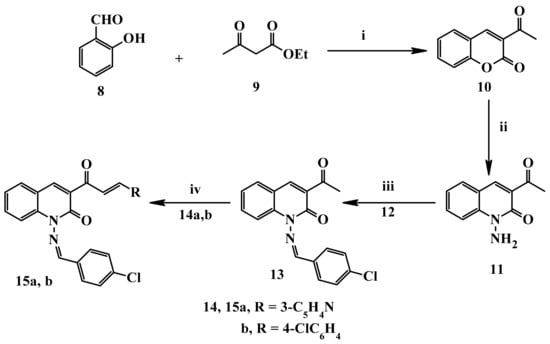 Reagent conditions: (i) Pip., EtOH, reflux, for 10: 80%. (ii) EtOH, NH2NH2. H2O, reflux, for 11:80%. (iii) 4-Chlorobenzaldehyde (12), EtOH, AcOH, reflux, for 13: 93%. (iv) RCHO (14a, b), Pip., EtOH, reflux, for 15a: 95%; for 15b: 97%.