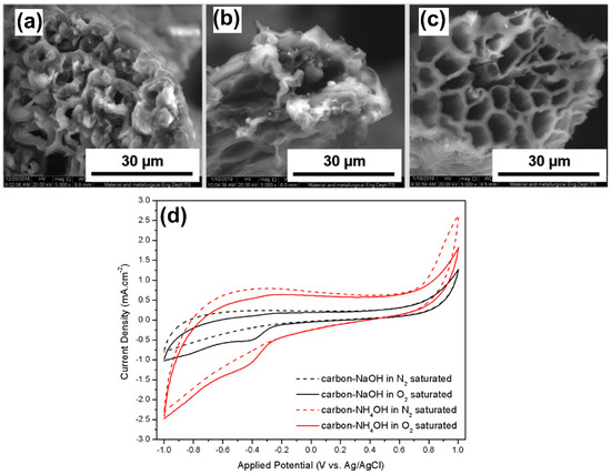 SEM images of the (a) cellulose aerogel, (b) carbon−NaOH aerogel, and (c) carbon−NH4OH aerogel. (d) CVs obtained for the different aerogels in O2 and N2 saturated solutions. Reprinted with permission from [36]. The American Chemical Society, Washington, DC, USA, 2020.