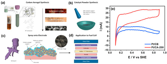 (a) Synthesis of CA, (b) Pt/catalyst (e.g., Pt/CA or Pt/CB) preparation, (c) application onto the electrode, and (d) membrane electrode assembly (MEA) preparation. (e) CVs of Pt/CB and Pt/CA-200 catalyst layer for ECSA analysis by hydrogen adsorption/desorption at a scan rate of 20 mV s−1. Reprinted with permission from [38]. Elsevier, Amsterdam, The Netherlands, 2021.