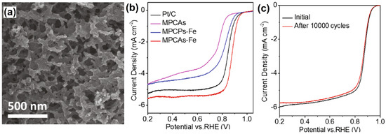 (a) SEM image of MPCAs–Fe and (b) ORR polarization curves of Pt/C, MPCAs, MPCAs–Fe, and MPCPs–Fe catalysts at a rotation rate of 1600 rpm in O2-saturated 0.1 mol L−1 KOH solution at a scan rate of 10 mV s−1. (c) ORR polarization curves of MPCAs–Fe before and after 10,000 CV cycles. Reprinted with permission from [46]. Elsevier, Amsterdam, The Netherlands, 2021.