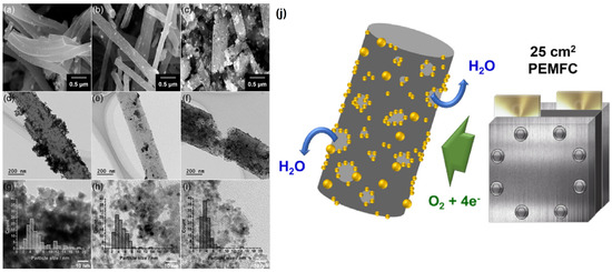 (a–c) FE-SEM, (d–f) TEM, and (g–i) HR-TEM images of Pt/CNF, Pt/GCF-HT, and Pt/GCF-(Co) (inset: Pt particle size distribution). (j) Scheme for the meso/macroporous graphitized carbon-supported Pt catalyst in the PEMFC cathode. Reprinted with permission from [74]. Elsevier, Amsterdam, The Netherlands, 2020.