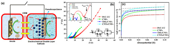 Cai and co-workers [76] developed a new MFC (Figure 6a) using CNTs/CNFs electrodes. The resulting catalyst had a high power density of 306 ± 14 mW·m−2, which was 140% superior to the conventional Pt/C. The longevity of the CNTs/CNFs catalyst was tested, and it was found that catalytic activity was retained up to 60 days without a voltage drop. The EIS was used to examine the internal resistance of the developed catalyst. The value of the first intersection of Nyquist plots and the Z’ axis was the value of an analogous electrical circuit consisting of an ohmic resistance (Rohm). The Nyquist plots were fitted with different vital experimental parameters such as double-layer capacitance, Warburg impedance, electrolyte diffusion resistance, pore adsorption capacitance, and charge-transfer resistance (Figure 6b). Tafel plots were used to compute exchange current density (i0), a crucial characteristic of ORR activity, by fitting the over potential from 80 to 100 mV (Figure 6c). Overall, the CNTs/CNFs electrode achieved a high apparent capacitance (0.68 ± 0.11 F·cm−2) and a long discharge time, which could be attributed to the simultaneous effects of electrochemical double-layer capacitance and pseudo-capacitance behavior. These characteristics indicated that CNTs/CNFs are promising catalysts for MFCs applications.