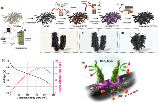 Yoon et al. [77] demonstrated the CoOx@CoNy/NCNF550-catalyst-coated MEA used for ORR application. Figure 7a illustrates the fabrication processes of CoOx@CoNy/NCNFs achieved at various nitridation temperatures. Initially, 1D-N-doped CNF (NCNF) paper was made by electrospinning polyacrylonitrile (PAN) soaked in dimethyl formamide (DMF) solution and then carbonizing it. A consistent polydopamine (PD) coating layer formed on the surface of the NCNF paper by immersing it in a dopamine solution at ambient temperature. After 12 h of dopamine polymerization, the solution color changed from pale brown to dark brown. With a significant power density (~80 mW cm−2) of 177.2 mA cm−2, the CoOx@CoNy/NCNF550-catalyst-coated MEA demonstrated outstanding electrochemical ORR performance in AMFC (Figure 7b). It was revealed that the observed excellent ORR and OER activities were associated with the synergic effect between CoOx@CoNy nanorods and NCNF. The ORR activity of NCNF was investigated, and the authors realized that it had a very poor catalytic response as a result of the 2e− transfer process [78]. The ORR was assisted by the interfacial rim sites between the CoOx@CoNy and NCNF, which allowed for moderate adsorption of intermediates and quick charge injection. Moreover, the Co4N nanorods’ oxidized coatings offered effective OER active sites with increased Co d-band vacancies.