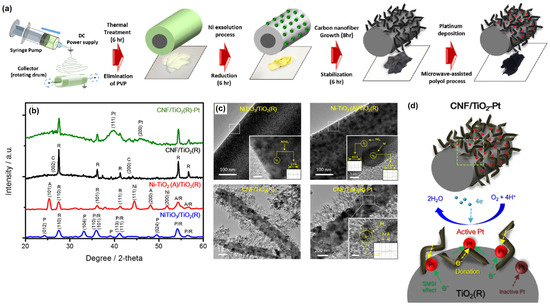 (a) Schematic illustration of synthesis procedure of the CNF/TiO2−Pt nanofibrous catalyst, (b) XRD patterns, (c) HR-TEM images of NiTiO3/TiO2, Ni-TiO2/TiO2, CNF/TiO2, and CNF/TiO2−Pt nanofibers, and (d) Schematic illustration of the Pt chemical state and catalytic reaction mechanism of the CNF/TiO2−Pt catalyst. Reprinted with permission from [79]. The American Chemical Society, Washington, DC, USA, 2018.