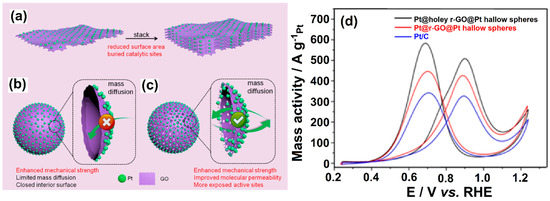 Schematic diagram of (a) 2D-GO/Pt NPs, (b) 3D-GO Pt@r-GO@Pt hollow nanospheres, and (c) 3D-Pt@holey r-GO@Pt hollow nanospheres, and (d) Pt mass-normalized CV curves recorded in an N2-saturated 0.5 mol L−1 of H2SO4 + CH3OH solution with a sweep rate of 50 mV s−1. Reprinted with permission from [95]. The American Chemical Society, Washington, DC, USA, 2018.