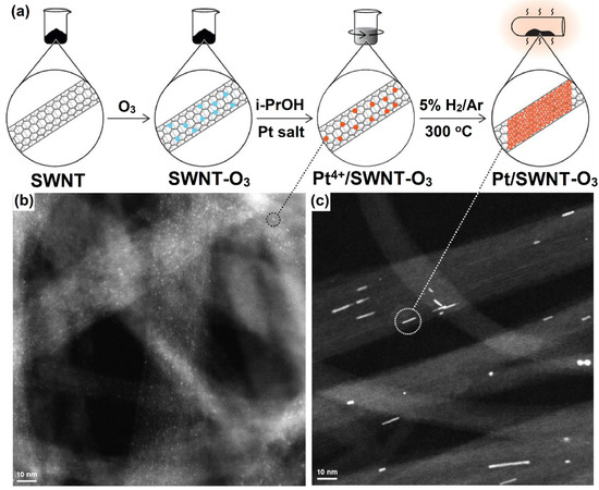 (a) Schematic illustration of the synthesis of Pt/SWNT-O3 with 3.9 wt% of Pt content; HAADF/STEM image of (b,c) CNT bundles with Pt/SWNT before and after heat treatment. Reprinted with permission from [108]. Elsevier, Amsterdam, The Netherlands, 2020.