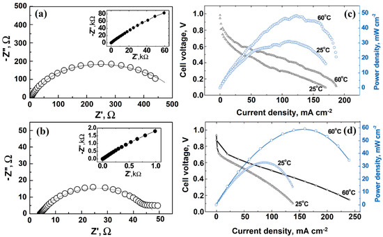 The AC impedance spectrum in Nyquist form for HER at an overpotential of 100 mV at the (a) CFE/CB/Pt electrode and (b) CFE/SWCNT/Pt electrode. (c) The power density and galvanostatic polarization data at different temperatures of an MEA prepared using a CFE/SWCNT/Pt anode and a CFE/CB/Pt cathode, and (d) the power density and galvanostatic polarization data at different temperatures of an MEA prepared using a CFE/SWCNT/Pt anode and cathode. Reprinted with permission from [112]. The American Chemical Society, Washington, DC, USA, 2005.