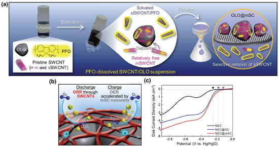 Yoo et al. [113] prepared ivy-like conductive m-SWCNTs nanonets using a one-pot surface engineering strategy as displayed in Figure 12a. The authors employed Nd0.5Sr0.5CoO3 (NSC)-perovskite as a catalyst for the ORR/OER to test the feasibility of m-SWCNTs. Using a rotating ring-disk electrode (RRDE), the electrochemical ORR/OER performance of the NSC@m-SWCNTs was investigated in an oxygen-saturated 0.1 MKOH. The well-developed m-SWCNT nanonets are projected to increase electron conductivity on the NSC surface, making the NSC@m-SWCNTs electrochemical kinetics easier. The catalytic ORR activity of SWCNTs is widely recognized [114]. As a result, the NSC@m-SWCNTs can demonstrate bifunctional OER/ORR activities (see Figure 12b). The NSC@m-SWCNTs had a better ORR onset potential (−0.12 V against Hg/HgO) than the NSC (−0.25 V vs. Hg/HgO) and NSC@p-SWCNTs (−0.18 V vs. Hg/HgO) in the cathodic scan (Figure 12c). The NSC@m-SWCNTs’ greater catalytic activity was attributable to their higher diffusion-limiting current density than the NSC and NSC@p-SWCNTs. The NSC@m-SWCNTs are a potential bifunctional catalyst, according to these findings. Despite the fact that this outstanding study shows tremendous potential, there are few publications on the use of isolated SWCNTs as ORR/OER electrocatalysts. In another study, the two different types of carbon nanotube (SWCNT and SWCNT/PANI)-based electrocatalysts were developed by the arc discharge method. The electrocatalysts SSA of hydrophilic and hydrophobic values and their interactions were discussed. The as-prepared SWCNT/PANI catalysts showed significantly enhanced fuel cell efficiency [115].