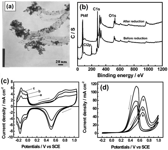 (a) TEM micrographs of Pt/MWCNT-10 nm, (b) XPS survey scan spectra of Pt/MWCNT nanocomposites before and after reduction treatment, and CVs of Pt/MWCNT nanocomposites prepared on MWCNTs with different diameters in (c) N2 saturated 0.5 mol L−1 H2SO4 and (d) CVs of Pt/MWCNT nanocomposites prepared on MWCNTs with different diameters in N2-saturated 0.5 mol L−1 H2SO4. Reprinted with permission from [129]. The American Chemical Society, Washington, DC, USA, 2006.
