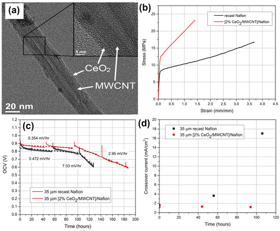 Generally, composite materials are often used for the development of polymer electrolyte membrane fuel cells. Barker et al. [130] showed the Nafion (NAF) proton exchange membrane and ceria-coated multi-walled carbon nanotube (CeO2/MWCNT/NAF) composite by wet chemical as well as solution-casting techniques. Figure 14a shows the TEM micrograph of the MWCNT wall after treatment of ceria nanoparticles, i.e., the diameter of the ceria particle was about 5 nm. The tensile strength and mechanical properties of CeO2/MWCNT/NAF composites were enhanced by the typical stress–strain study (Figure 14b). The electrode stability of the composite materials was tested using an open circuit potential value of the membrane degraded at 0.472 mV h−1, as shown in Figure 14c. The gas cross-over study revealed that the catalyst retained activity for up to 96 h (Figure 14d).