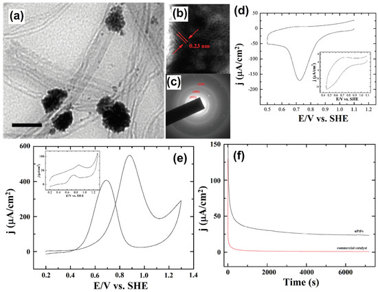 TEM (a,b) images and (c) SAED pattern obtained for the Pt nanoparticle decorated MWCNTs. The scale bar in (b) and (c) is 100 nm; (d) CV illustrates the electrocatalytic activity of nPtFs toward ORR in 0.5 mol L−1 H2SO4; scan rate: 25 mV s−1. (e) CV illustrating the electrocatalytic performance of nPtFs toward oxidation of methanol (0.1 mol L−1) in 0.5 mol L−1 H2SO4; scan rate: 25 mV s−1. Inset shows the voltammetric response of electrode modified with commercial catalyst toward methanol oxidation. (f) Chronoamperometric curves obtained for the oxidation of methanol (0.1 mol L−1) on nPtFs and commercial catalyst-modified electrodes. Reprinted with permission from [132]. The American Chemical Society, Washington, DC, USA, 2010.
