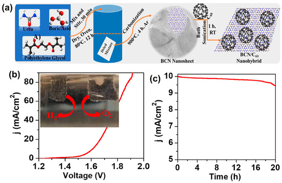 Buckminsterfullerene or C60 is an allotropic carbon present in different forms such as a spherical, tubular, and ellipsoid shape and was discovered by Kroto in 1985. It is represented as 0-D carbon-based materials [133]. Fullerene (C60) received considerable attention owing to its high electron transporting properties, good electron-accepting ability, and stable structural arrangements [134,135,136]. Moreover, C60-based electrode materials have been used as an efficient electrocatalyst in many fields, such as solar cells [137], batteries [138], biosensors [139], and fuel cells, etc. [140]. Having remarkable properties, such as convenience, low temperature operation, and high energy density of direct methanol fuel cells, using fullerene nanosheet modified (Pt/Ru/Sn/W fullerene) electrocatalysts could increase their catalytic activity with fuel cell efficiency [141]. The Pt-supported fullerene (Pt/C60(OH)24-27)-based electrocatalyst was synthesized through a simple process, where formic acid was used as a reducing agent. From TEM analysis, the agglomerated spherical-shaped fullerene (Pt/C60(OH)24–27) was obtained. Moreover, it can be used as an efficient electrocatalyst during the electrocatalytic oxidation of ethanol [142]. Rambabu and Bhat [143] developed a sulfonated polyether ether ketone supported sulfonated fullerene (SPEEK-Sfu)-based composite membrane by the diazotization reaction route. The SPEEK-Sfu composite membrane matrix showed better oxidation resistance with reduced methanol permeability in DMFCs. A new class of heterostructured boron nitride nanosheets was modified with fullerene molecules by a new strategic route to form 10% F/BCN multifunctional-based supramolecules (Figure 16a). Using the LSV technique, the constructed 10% F/BCN//10% F/BCN cell device exhibited remarkable current density (10 mA cm−2), and the insert digital image shows the overall water splitting process (Figure 16b). Finally, the 10% F/BCN electrocatalyst was tested through the chronoamperometric method, using a measurement period of about 20 h, showed good electrode stability (Figure 16c) [144].