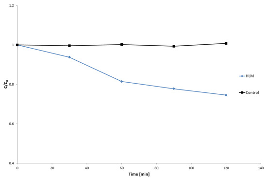 The in vitro biotransformation kinetics study of nebivolol in HLM was performed based on the evaluation of abundance of the parent ion (m/z 406.1824), in the studied time, the range of incubation (0–120 min) and moderate metabolism of the analyzed drug were observed (Figure 1). The obtained results showed that during 60 min of hepatic microsomes incubation about 20% of nebivolol was metabolized, and then the reactions of biotransformation slowed down. Taking this into account, the time of 60 min of HLM incubation with nebivolol was selected to perform all chemometric and qualitative analysis.