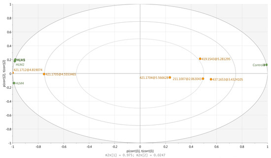 PCA biplot of HLM and Control samples (green) with the loadings (orange) of the entities (ions representing of the potential metabolites, expressed as nominal masses in Da).