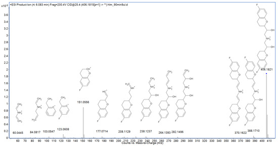 The LC-HR-MS analysis was performed with the use of Agilent high-resolution Q-TOF system series 6520 and UHPLC system series 1290 (Agilent Technologies, Santa Clara, CA, USA) with Kinetex C18 (2.1 × 50 mm, dp = 1.7 μm) column and C18 precolumn guard (Phenomenex, Torrance, CA, USA). In order to perform both qualitative and quantitative analysis of the studied processes, the MS detector was tuned in a positive mode in extended dynamic range (2 GHz). MassHunter workstation software in version B.04.00 (Agilent Technologies, Santa Clara, CA, USA) was used for the control of the system, data acquisition, qualitative, and quantitative analysis. To ensure accuracy of the masses’ measurements, a reference mass correction was applied and masses 121.050873 and 922.009798 were used as lock masses. MS detection based on the extracted ion current chromatograms (EIC) was applied for the quantitative analysis of nebivolol, and then auto MS/MS mode (using abundance algorithm) was used for registration of their fragmentation spectra. All the chromatographic and spectrometric parameters are described in Table S1.