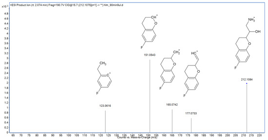 In the following study, six hepatic metabolites of nebivolol were found and identified using high-resolution mass spectrometry (Table 1). Five of them are previously reported products of alicyclic and aromatic hydroxylation, alicyclic dihydroxylation, and alicyclic oxidation [15]. Their fragmentation MS/MS spectra are presented in the Supplementary Material (Figures S1–S5). However, the sixth metabolite—identified as a product of nebivolol N-dealkylation—was not described so far. Its MS/MS spectrum was shown in Figure 5. The major fragmentation ion—m/z 151.0543—is typical also for the parent compound, and represents 6-FDBP, which undergoes further decomposition forming the m/z 123.0616 ion. Two remaining fragmentation ions were also observed in the MS/MS spectrum of nebivolol—m/z 177.0733, which corresponds to elimination of both ammonia and water molecules followed by its subsequent degradation leading to formation of the m/z 165.0742 ion. On the other hand, ions representing secondary amine fragments such as m/z 84.0817 and 70.0663 were not detected in the spectrum, which confirms that N-dealkylation indeed took place in the case of M6.