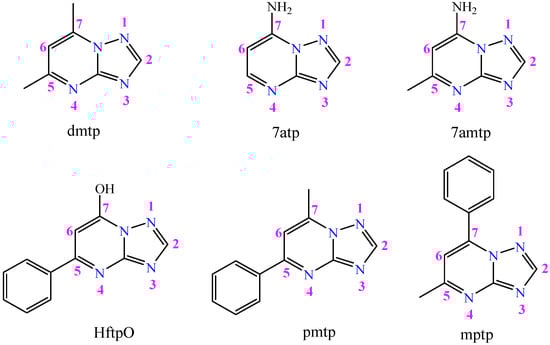 - Łakomska, I.; Fandzloch, M. Application of 1,2,4-triazolo[1,5-a]pyrimidines for the design of coordination compounds with interesting structures and new biological properties. Coord. Chem. Rev. 2016, 327–328, 221–241. [Google Scholar] [CrossRef]