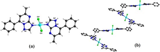 Slow evaporation of the ethanolic solution of trans-[Cu(mptp)2Cl2] (1) led to a mononuclear coordination complex (Figure 2a). Compound (1) crystallized in the P21/n monoclinic space group, with cell parameters and structure-refinement details given in Table 1.