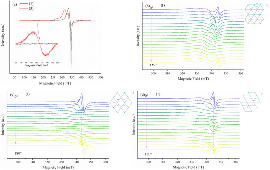Powder EPR spectra of the complexes (1) and (3) at room temperature (a), EPR spectra of a single crystal of complex (1) with B0 perpendicular to the ca (b), ab (c), and bc (d) planes, with rotation along the c, a, and b axes.