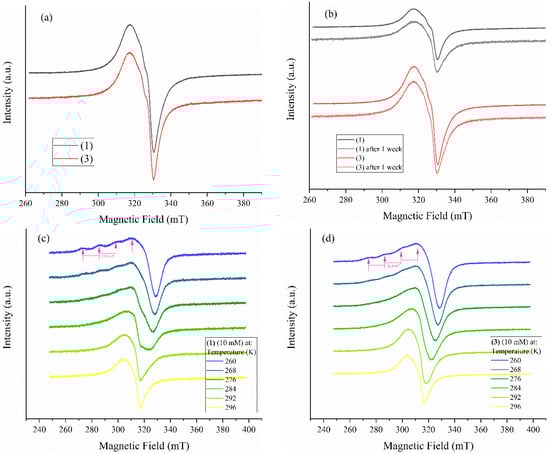 EPR spectra of complexes (1) and (3) in 10 mM DMSO solution: freshly prepared (a), after one week (b), and at temperatures ranging from 260 to 296 K for (1) (c) and (3) (d).