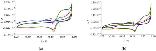 The study of the electrochemical behavior of the Cu(II) complexes (1) and (3) was carried out to investigate the oxidation-reduction process, in the range of +0.10 → +0.90 V → −1.20 V (Figure 6). In the positive range, the oxidation processes of Cu(II)/Cu(III) can be observed at Epa1 = +0.481 V for complex (1) and Epa1 = +0.583 V for complex (3), with values shifted to a positive range compared to those obtained for the [Cu(DMSO)6]Cl2 species, leading to higher values of E1/2 proper for the hydrogen peroxide reduction. Cyclic scanning between +0.90 and −1.20 V shows a large reduction counter-peak at Epc1 = +0.200 V for all copper compounds (Table 4). For complex (3), a reduction wave at Epc2 ~ −0.800 V is also observed, which can be assigned to the reduction of both the ligand and Cu(II)/Cu(I).