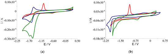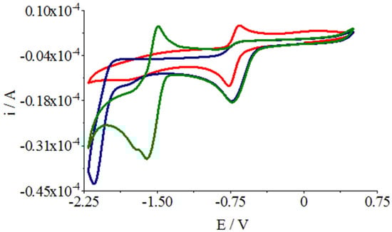 Cyclic voltammograms of the electrolyte solution, 0.1 M Bu4NClO4 in DMSO without de-aeration with argon (red line), complex (2) (green line) and complex (4) (blue line), complexes’ concentration 1 mM in DMSO without de-aeration (scan rate: 0.100 V/s, working electrode: glassy-carbon disk: reference electrode, Ag/AgCl (0.1 M Bu4NClO4 in DMSO)).