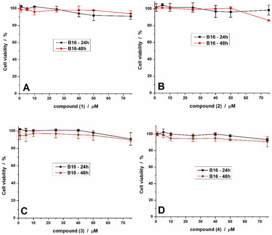 The cytotoxic effect of the compounds (1)—(A), (2)—(B), (3)—(C) and (4)—(D) on B16 cells evaluated after 24 and 48 h (each value represents the mean ± SD).