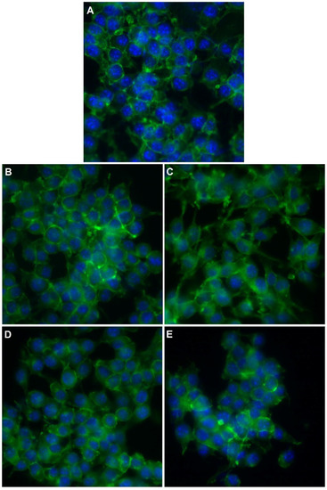 In order to determine how the compounds affect the cell morphology, the nucleus and cytoskeleton of the cells were marked for those treated with concentrations of 25 and 75 µM. The results presented in Figure 10 show that the morphology of the cells treated with a 25 µM solution of the compounds is not changed, and a similar number of cells appears. The cells treated with 75 µM also show no significant changes. However, the number of cells is reduced, indicating that the treatments kill the cells.