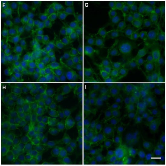Cell morphology of B16 cells: control cells (A), treated with 25 µM (B) and 75 µM (C) compound (1), treated with 25 µM (D) and 75 µM (E) compound (2), treated with 25 µM (F) and 75 µM (G) compound (3) and treated with 25 µM (H) and 75 µM (I) compound (4) for 24 h. Cell nuclei are stained with Hoechst 33342 (blue), and actin filaments are stained with Phalloidin-FITC (green). The scale bar is 20 μm and the same for all images.