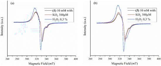 The stability of complexes (1) and (3) in a DMSO solution is presented in Figure 5b. The line shape and intensity of the EPR spectra present no changes, showing excellent stability of the Cu(II) complexes even after this long period.
