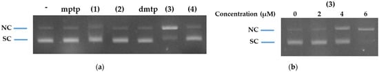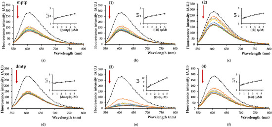 To record the DNA/EB fluorescence spectra, we used the total DNA isolated from bacteriophage λ (λ-DNA, Promega, Madison, WI, USA). The binding of compounds to λ-DNA was assayed by monitoring the quenching of fluorescence emitted by λ-DNA/EB adduct (λexcit = 510). The λ-DNA solution (3 μM in Tris-HCl/NaCl buffer solution) was first added to the EB solution prepared in the same buffer, then increasing concentrations of compounds (1)–(4) were added to λ-DNA/EB [55,56]. The fluorescence spectra were recorded in the range of 550–800 nm using a Thermo Fischer Scientific Varioskan Flash spectral scanning multimode reader (Vantaa, Vantaa, Finland). The spectra were recorded in suitable plates using 5 nm excitation and emission slits for all measurements.