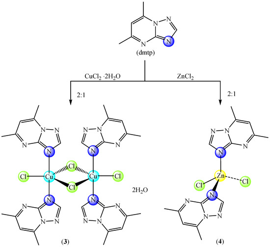 The synthesis route of [Cu2(dmtp)4Cl4]·2H2O (3) and [Zn(dmtp)2Cl2] (4).