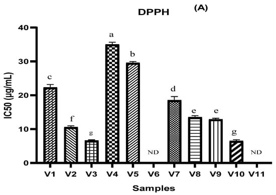 The antioxidant activity of the different types of vinegar studied in this research was evaluated using three complementary tests: DPPH, FRAP, and TAC assay. The results are shown in Figure 1. It is shown in these results (Figure 1A) that V10, V3, V2, V9, and V8 have a lower DPPH IC50 value (6.441 µg/mL, 6.581 µg/mL, 10.508 µg/mL, 12.852 µg/mL, and 13.465 µg/mL, respectively), while 50% inhibition for V6 and V11 was not attained. According to the results found by [35] on various fruit vinegars, the peach vinegar and the grape vinegar record a higher value of antioxidant activity using DPPH assay (94.7 ± 0.7% and 82.4 ± 1.5%, respectively) in comparison with apple vinegar which was between 61.2 ± 0.4% and 72.2 ± 1.4% [35]. In addition, Ozturk et al. reported several ranges of DPPH values, which ranged from 4.93% to 89.53% for grape vinegar, while they ranged from 0.53% to 65.12% for apple vinegar [6]. In addition, the antioxidant property of fruit vinegar, including traditional balsamic vinegar and peach vinegar, was over 90% [35]. The antioxidant power based on the FRAP assay indicated significant outcomes between different samples (Figure 1B). The IC50 values of V8, V7, and V2 were much lower (8.369 µg/mL and 19.072 µg/mL, respectively) than V1, V4, V5, V9, and V10 while the highest IC50% value was recorded in the V10 sample (461.536 µg/mL). According to [12], the FRAP values of apple vinegar were lower than those of grape vinegar. As shown in Figure 1C, among the tested vinegar samples, V1 and V8 were found to exhibit the highest total antioxidant capacities with the values of 134.068 and 119.903 µg AAE/mL, respectively. While the lowest values were recorded in V11 (31.814 µg AAE/mL). In a related study, [35] recorded that, in peach vinegar, the IC50 was (13.1 ± 0.6 µg/mL). Several studies have reported that the difference in antioxidant capacity is due to differing their phytochemical profiles and initial raw materials [14].