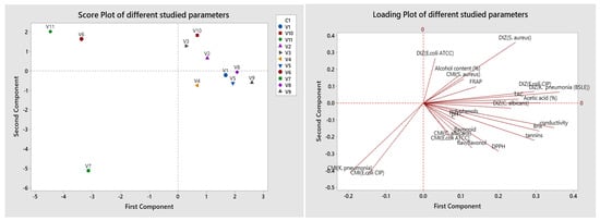 Results of PCA obtained in Figure 2 show that the eigenvalues of the first four principal components represent 73.1% of the variation in the data. The first principal component shows a strong positive correlation with acetic acid, Brix, conductivity, and DIZ of K. pneumonia. The second component shows a positive correlation with DIZ of S. aureus, and a negative association with MIC of E. coli CIP and MIC of K. pneumonia. While the third component is correlated positively with flavonoids and flavonols/flavanone, and negatively with MIC of E. coli ATCC and C. albicans. The fourth one shows a negative correlation with polyphenols, and positively correlated with pH and MIC of S. aureus. In general, the variables are distributed on the different sides of the axis. However, the projection of the scoring diagram and the contribution diagram visually shows a positive contribution of physicochemical properties on the first main axis in positive correlation with V1, V2, V5, V8, and V9, while V6 and V11 were correlated negatively. The second component measures some of the antimicrobial activity of V3, V7, and V10.