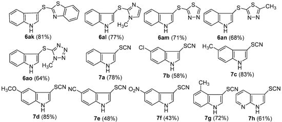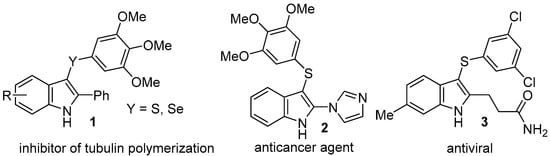 - Silveira, C.C.; Mendes, S.R.; Wolf, L.; Martins, G.M.; von Mühlen, L. Efficient synthesis of 3-selanyl- and 3-sulfanylindoles employing trichloroisocyanuric acid and dichalcogenides. Tetrahedron 2012, 68, 10464–10469. [Google Scholar] [CrossRef]