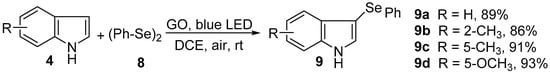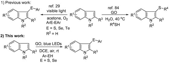 - Liu, C.P.; Peng, X.J.; Hu, D.; Shi, F.; Huang, P.P.; Luo, J.J.; Liu, Q.; Liu, L.X. Direct C3 chalcogenylation of indolines using a graphene oxide-promoted and visible-light-induced synergistic effect. N. J. Chem. 2020, 44, 17245–17251. [Google Scholar] [CrossRef]