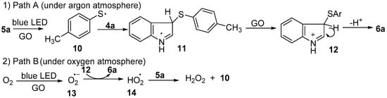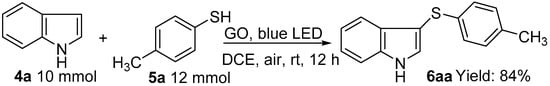 - Chen, M.; Luo, Y.; Zhang, C.; Guo, L.; Wang, Q.T.; Wu, Y. Graphene oxide mediated thiolation of indoles in water: A green and sustainable approach to synthesize 3-sulfenylindoles. Org. Chem. Front. 2019, 6, 116–120. [Google Scholar] [CrossRef]