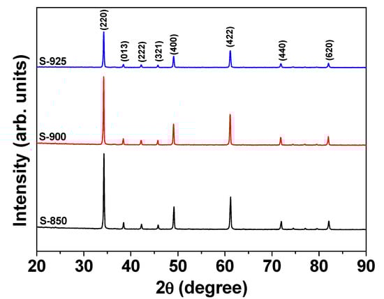 Room-temperature XRD patterns of the crushed pellets of NLCTO ceramics are shown in Figure 1. All the observed diffraction peaks are consistent with the cubic structure according to JCPDS#75-2188, with no secondary phase peaks. As can be seen in Figure 1, the diffraction peak (220) shifts toward a lower value of 2θ with increasing sintering temperature. This shift indicates an increase in the lattice constant of the ceramics with increasing sintering temperature. The lattice constants of the cubic phase for the investigated ceramics were calculated from the XRD patterns using the UnitCell program. The calculated values of the lattice parameter were found to be 7.413(5), 7.423(1), and 7.419(7) Å for the ceramics S-850, S-900, and S-925, respectively. These values are comparable to those reported for the NLCTO system [23,24]. During the SPS process, some Ti4+ ions convert into Ti3+ ions by capturing electrons resulting from oxygen vacancies [25]. Due to the difference in the ionic radii of Ti4+ and Ti3+, which are 0.605 and 0.670 Å [26], respectively, the lattice constant slightly increased with increasing sintering temperature. The densities of the current ceramics as measured from the mass and geometrical dimensions of the pellet were 5.03, 5.15, and 5.09 g/cm3 for S-850, S-900, and S-925, respectively. Besides, the theoretical density (ρtheor) was calculated using ρtheor= ZM/NAV, where Z is the number of atoms per unit cell (for body-centered cubic structures, Z = 2), M is the molecular weight corresponding to the chemical formula, NA = 6.022 × 1023 mol−1 is Avogadro’s number, and V is the unit cell volume determined from X-ray measurements [27,28]. The calculated ρtheor values were found to be 5.33, 5.32, and 5.33 for S-850, S-900, and S-925, respectively. Therefore, the experimental density of all the current samples was higher than 94% of the theoretical value.