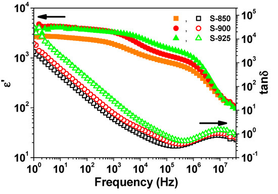 Frequency dependence of ε′ and tan δ at selected temperatures for (a) S-850, (b) S-900, and (c) S-925.
