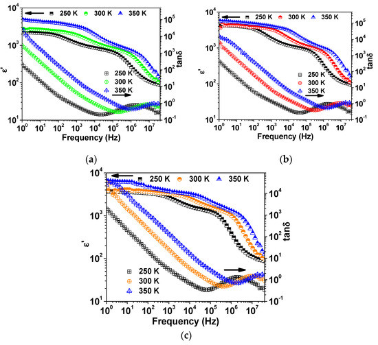 The frequency dependence of the dielectric constant (ε′) and dielectric loss (tan δ) at room temperature is depicted in Figure 4. All the samples showed colossal dielectric constants (ε′ > 103) over most of the frequency range. As seen in Figure 4, with increasing sintering temperature, both ε′ and tan δ increase. Moreover, the sample S-900 showed the best compromise between the minimum tan δ (~0.39) and colossal ε′ (~1420) at 200 kHz. The dielectric constant of SPS NLCTO ceramics is comparable with the literature values [22,23]. Meanwhile, their dielectric losses are noticeably high compared to literature values. Figure 5 shows the frequency dependence of ε′ at selected measuring temperatures. The spectrum of ε′ at a given temperature of each sample was found to decrease with increasing frequency, accompanied by a relaxation peak in the spectrum of tan δ. It is seen that the relaxation peak shifts toward a higher frequency with increasing measuring temperature, which signifies a thermally activated process.
